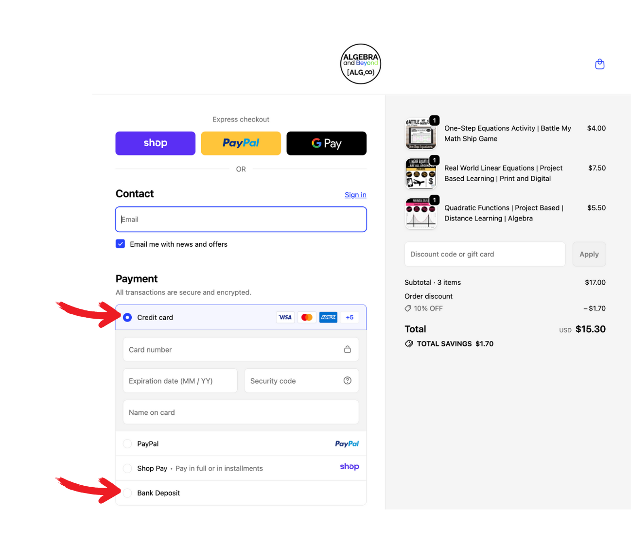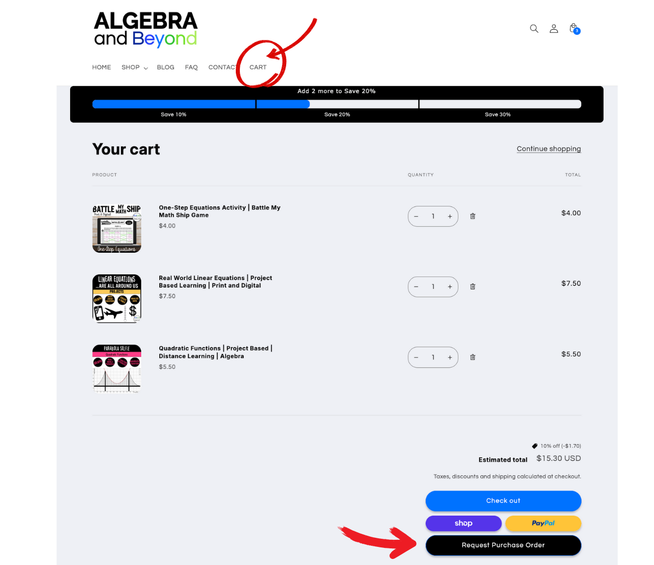 Thank you for your interest in using Algebra and Beyond resources for your classroom! I've made it easy to request a school purchase order with these 4 simple steps. If you have any questions along the way, I'm happy to help! Contact me at tyra@algebra-and-beyond.com