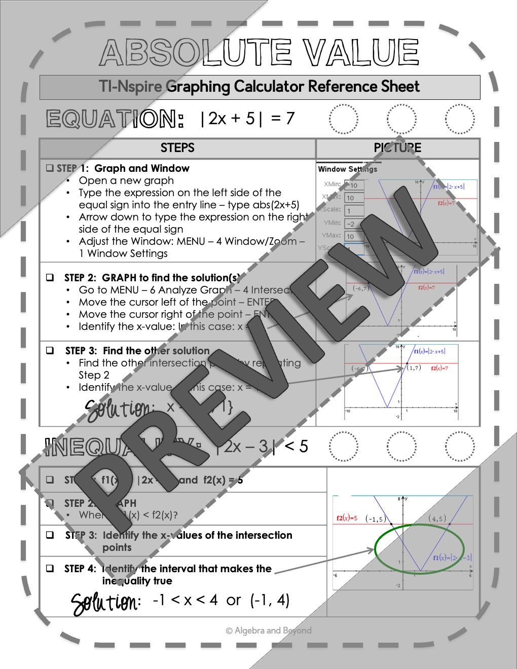 Absolute Value Equations and Inequalities | TI-Nspire Calculator Reference Sheet