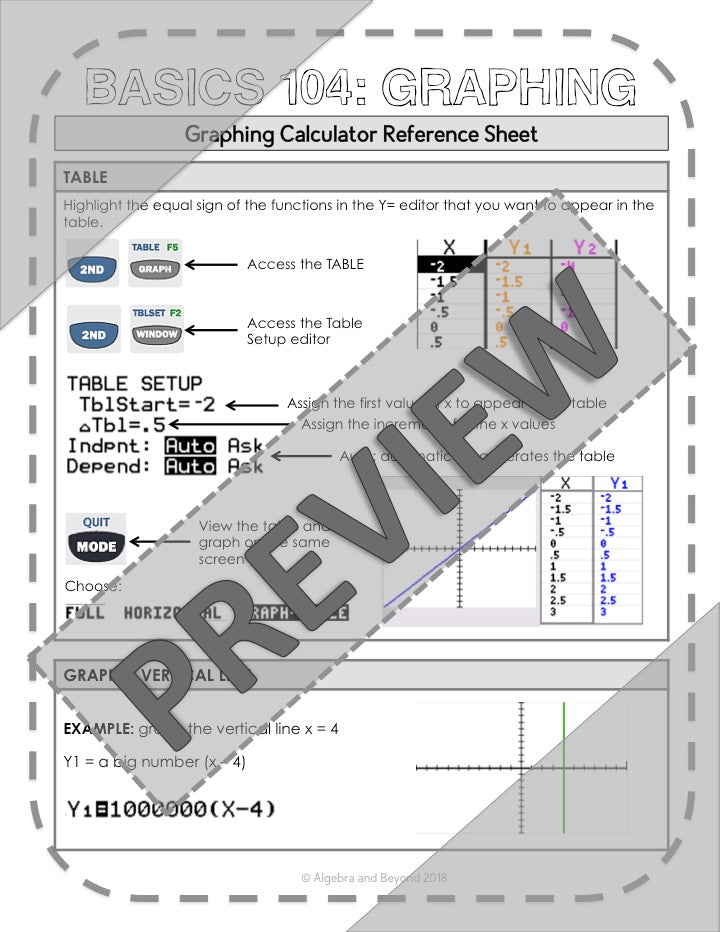 Graphing calculator reference sheets guide students step-by-step on how to use the calculator for various math concepts, graphing, and solving.