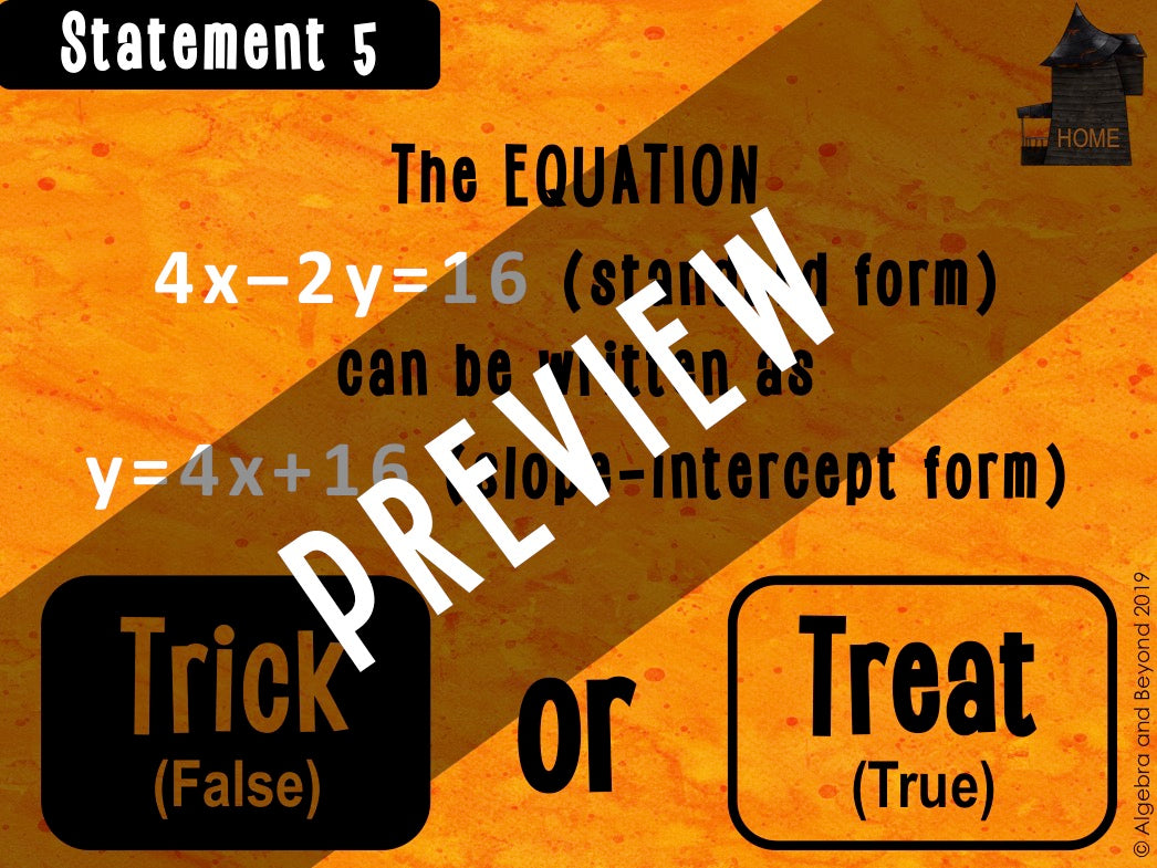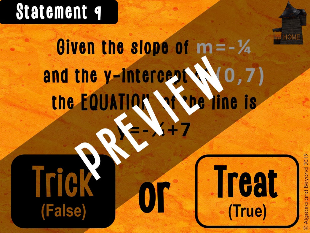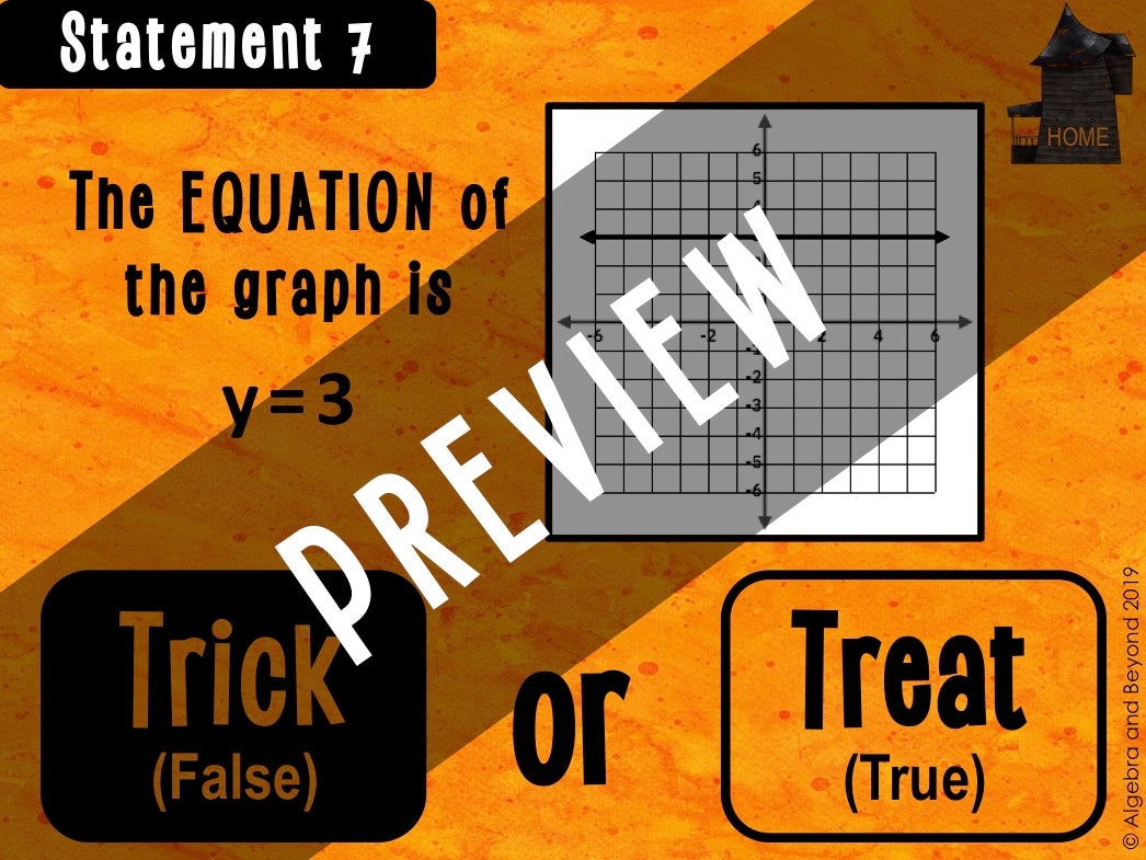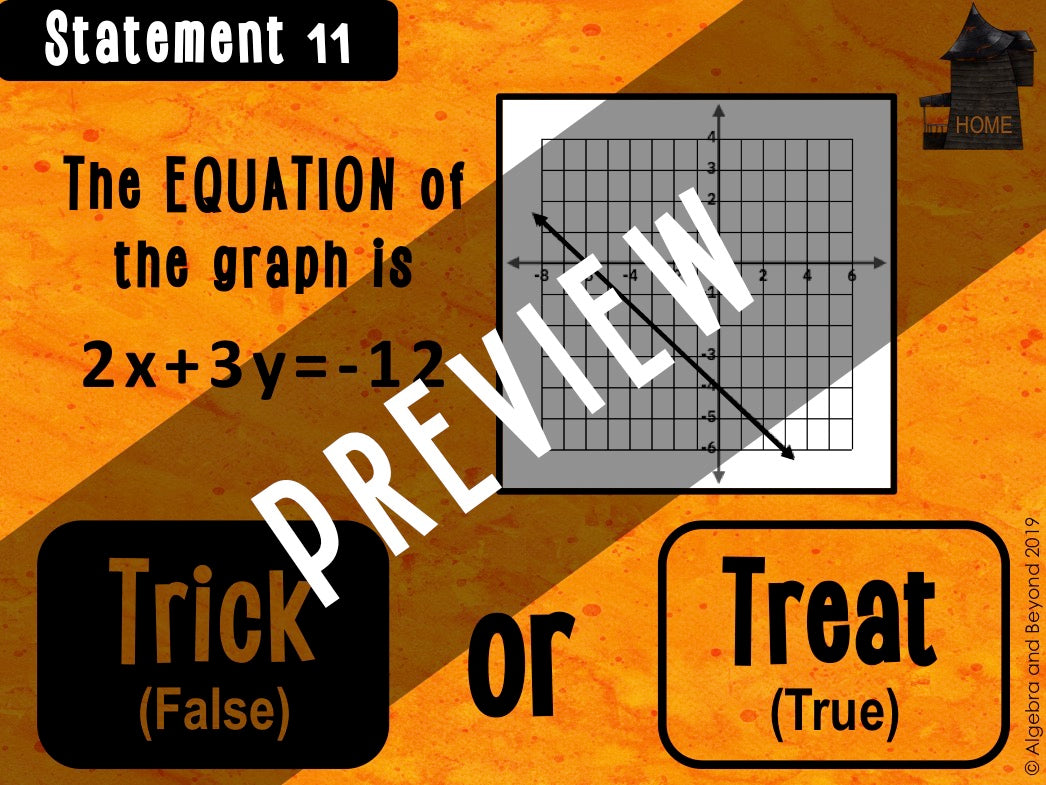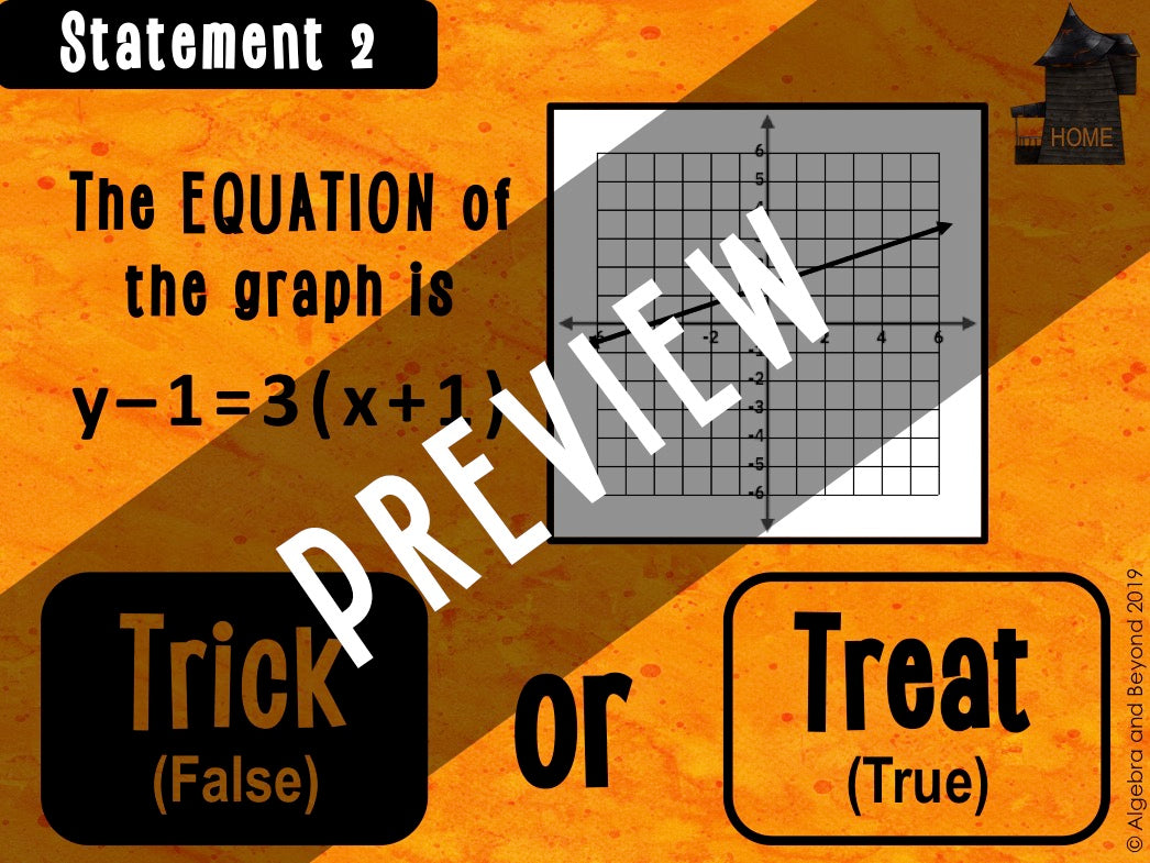 This is a Trick (False) or Treat (True) digital activity that reviews linear equations by comparing equations to graphs and writing equations given information. Great review at the end of a linear equations unit!