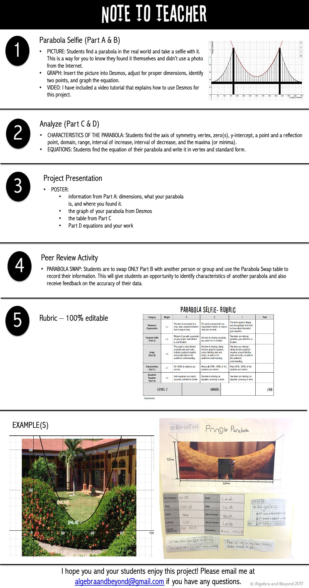This was the perfect project to finish our Quadratics Units in Algebra 1. My students enjoyed finding parabolas in the real world and they enjoyed using Desmos to practice their graphing. The instructions and worksheets provided were clear, and the video explanation was helpful for my students. Definitely recommend this resource.