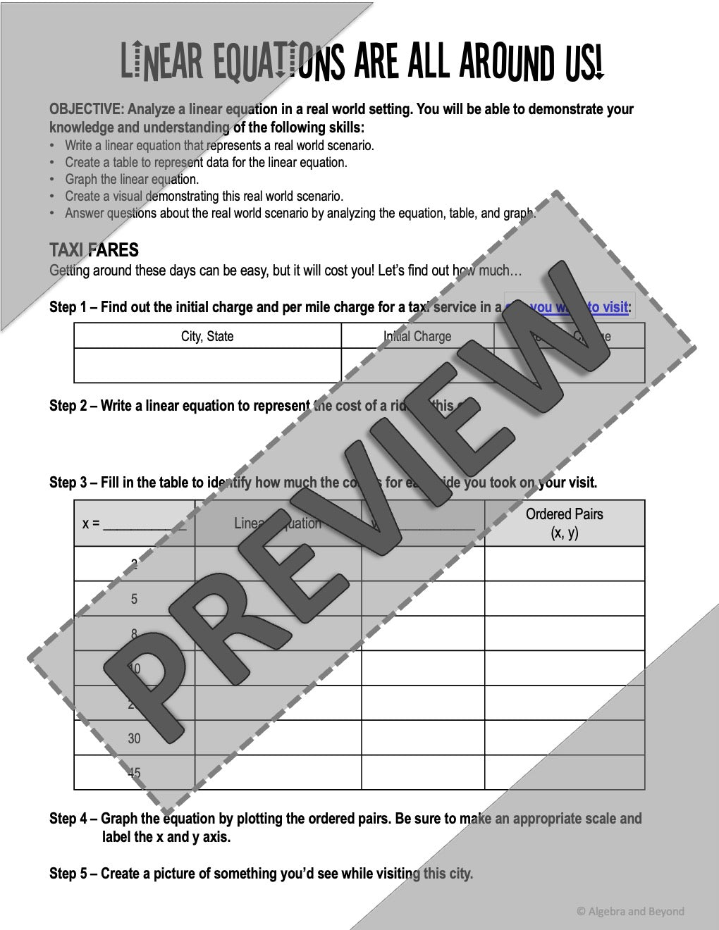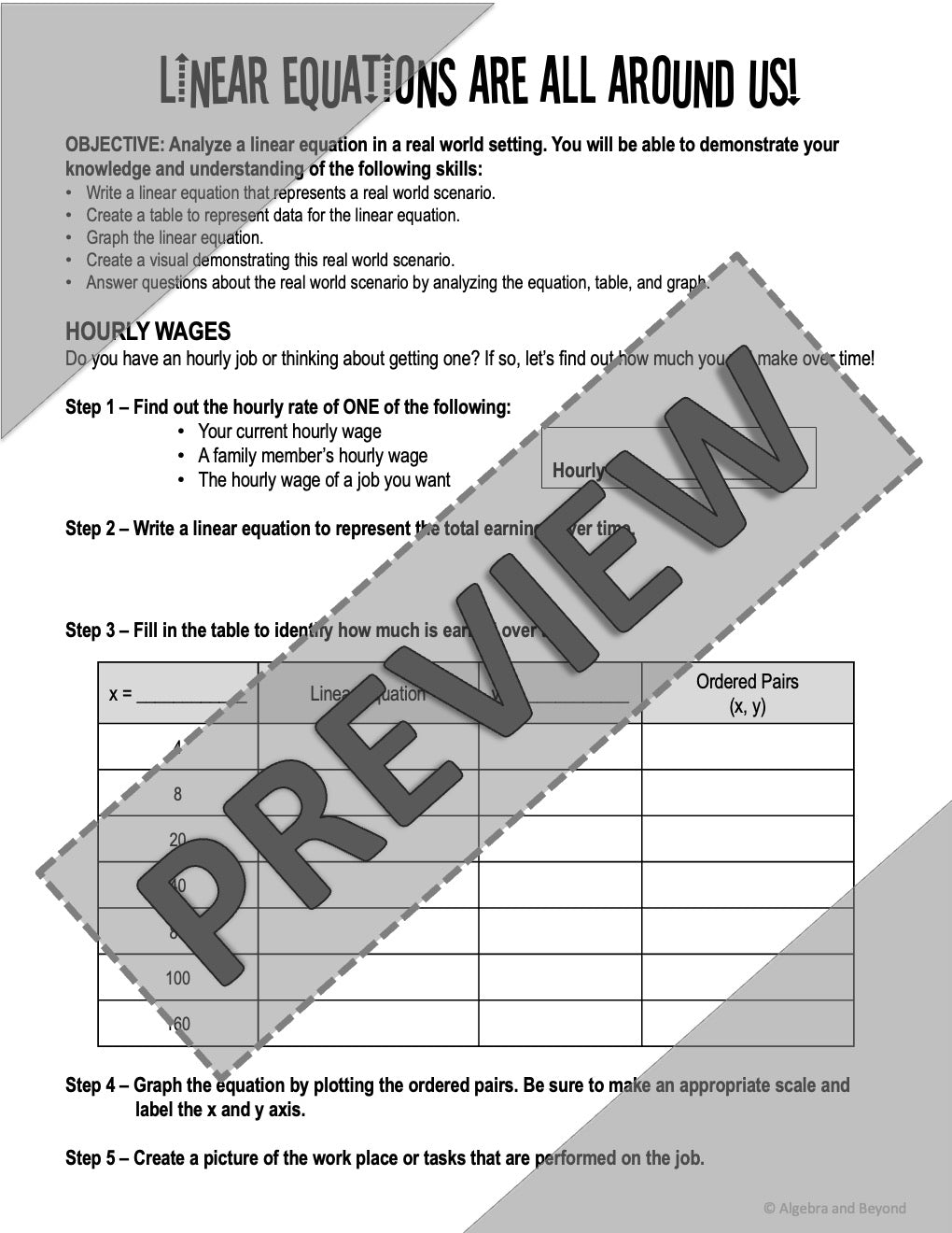 Linear equations are all around us! This resource includes SIX different projects (100% editable) from basic to advanced levels of Pre-Algebra and Algebra.
