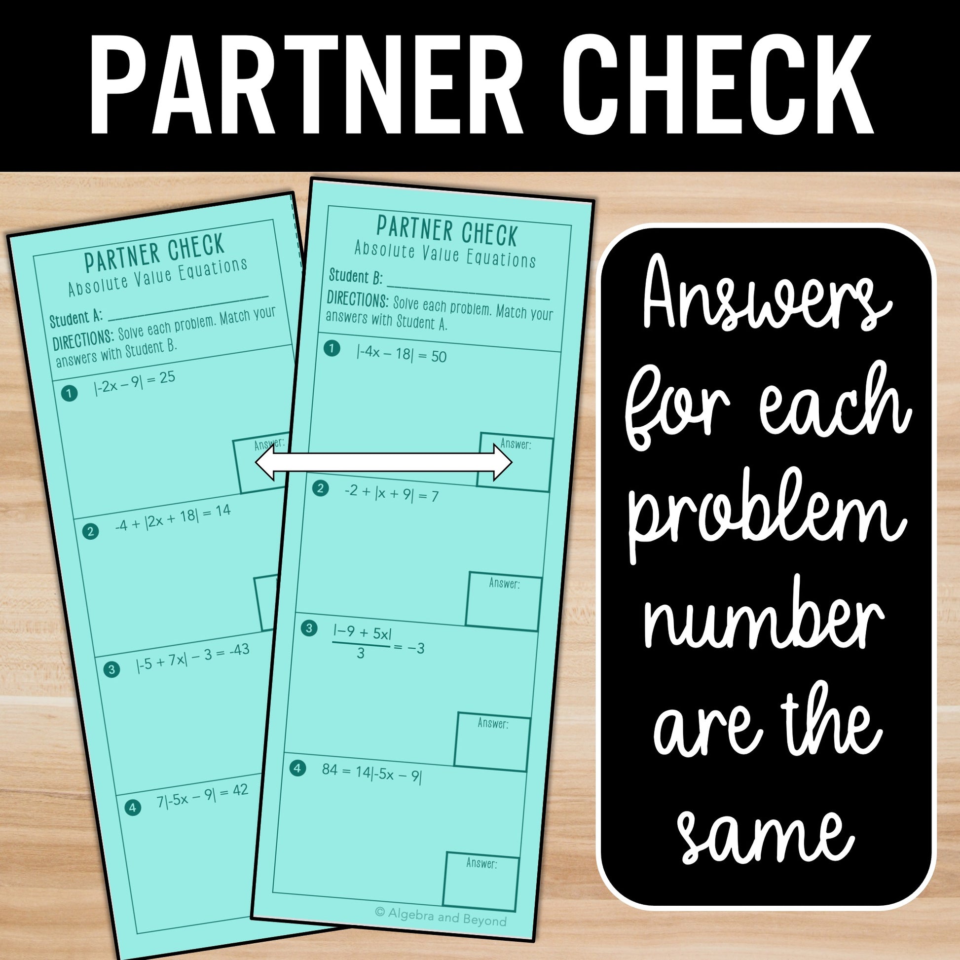 Solve Absolute Value Equations Review Practice Activity – Partner Worksheets