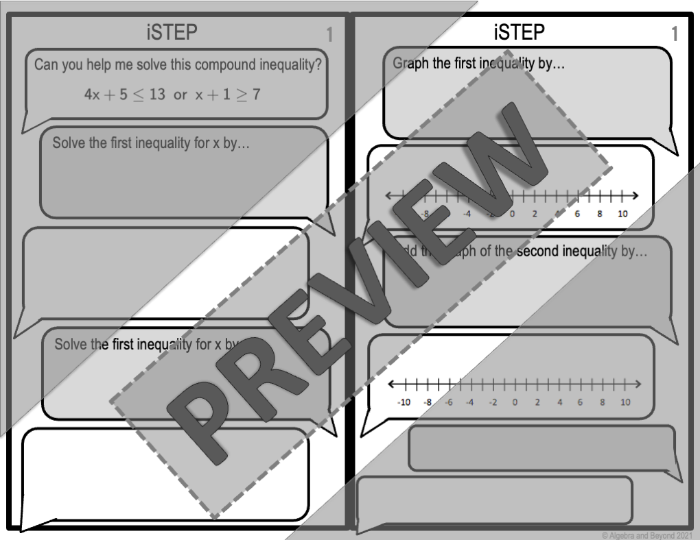 These sheets include solving compound inequalities using text bubbles for verbal steps and student work.