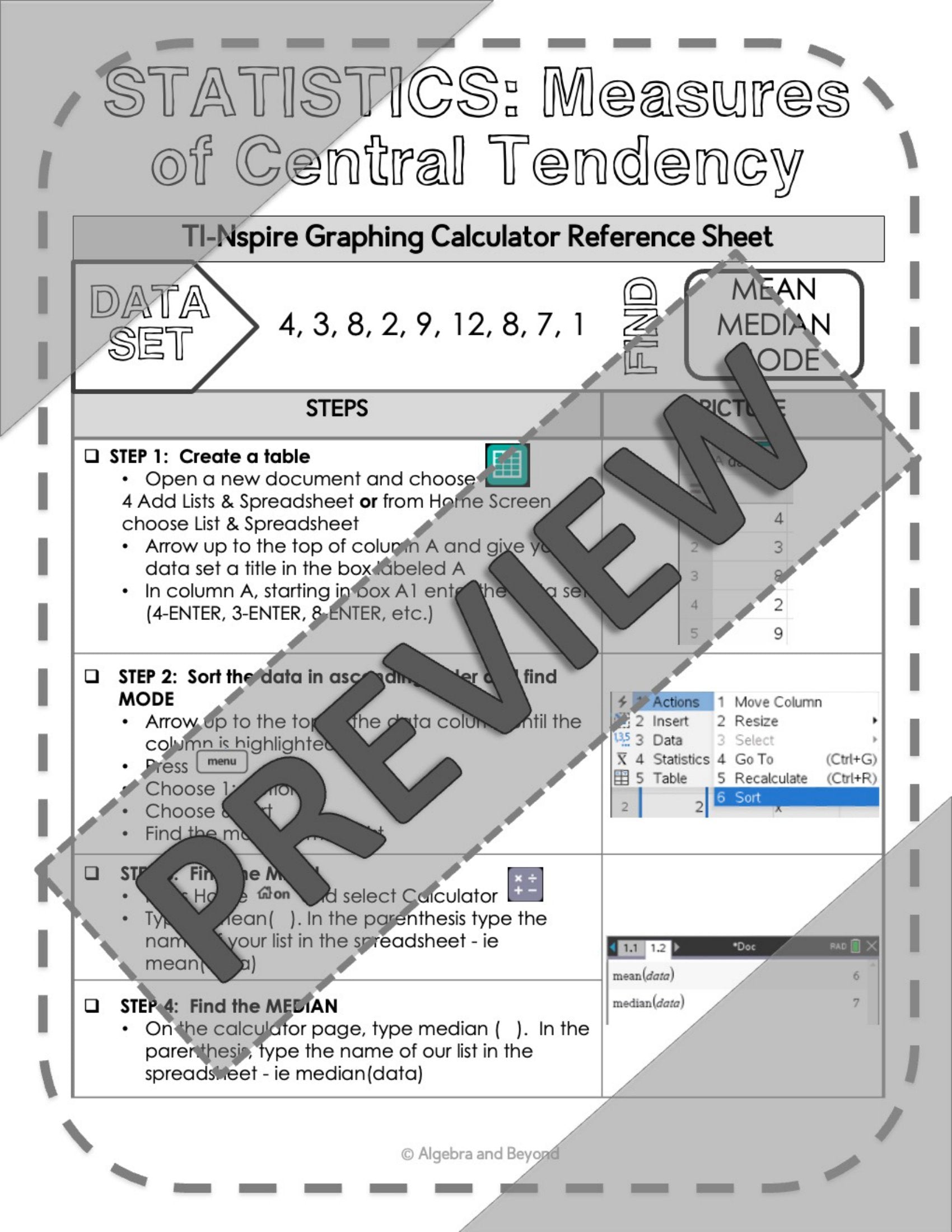 Statistics | Measures of Central Tendency | TI-Nspire Calculator Reference Sheet
