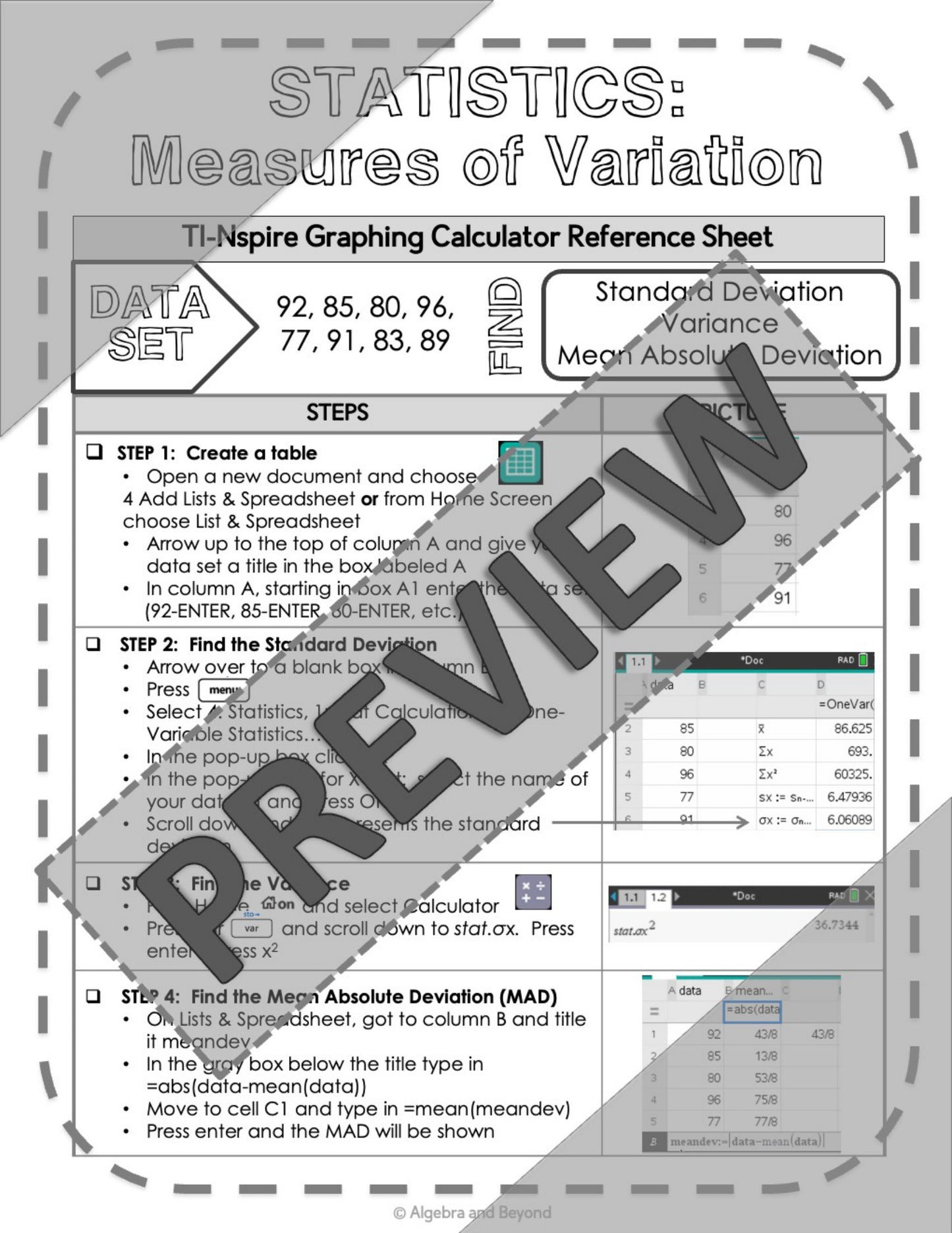 Statistics | Measures of Variation | TI-Nspire Calculator Reference Sheet