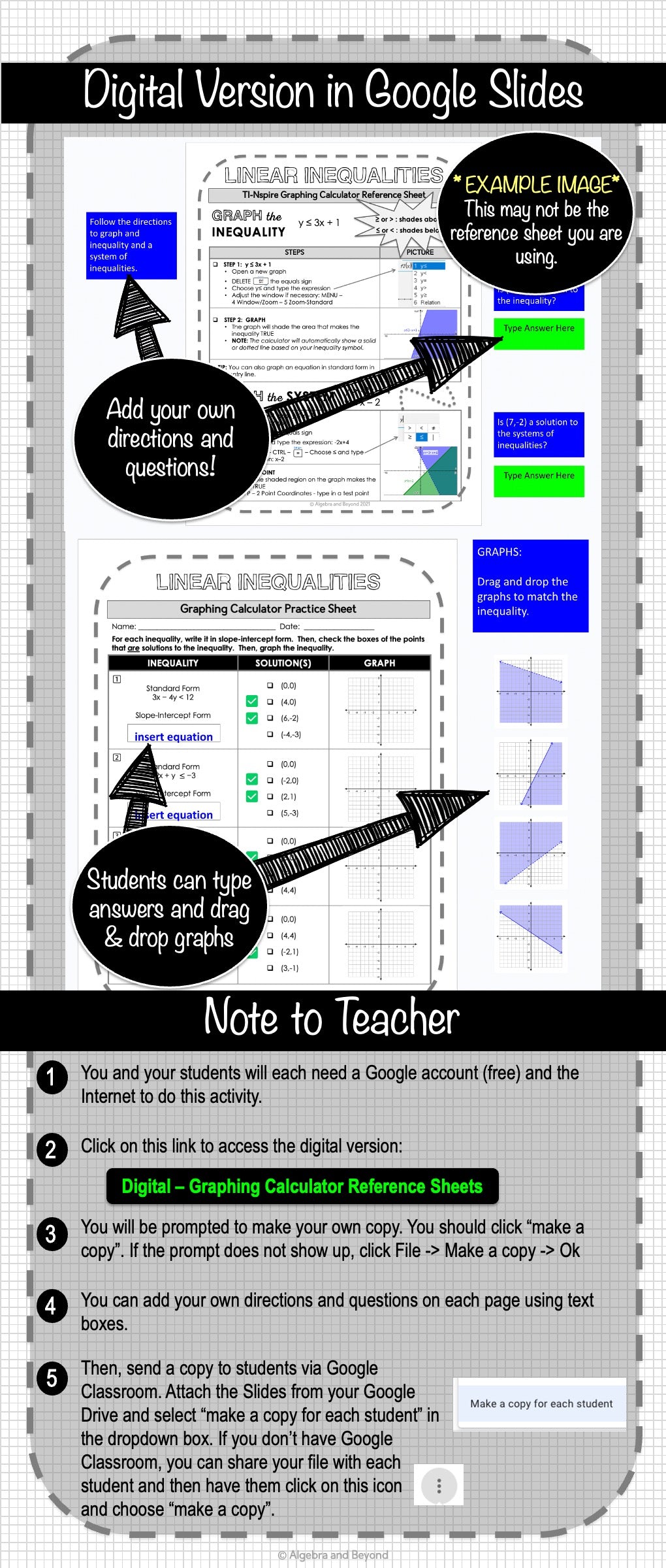 Graphing calculator reference sheets guide students step-by-step on how to use the calculator for various math concepts, graphing, and solving. The practice sheet helps them review the content and steps they've learned.